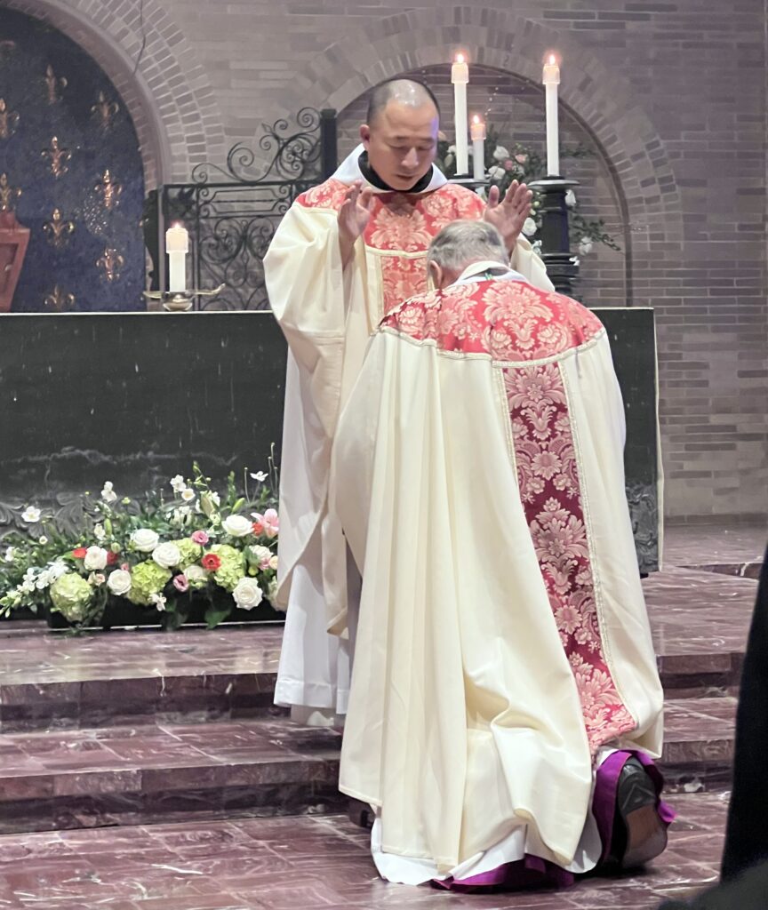 Bishop McManus knelt down to receive the priestly blessing of Fr. John, whom he had ordained only minutes before.