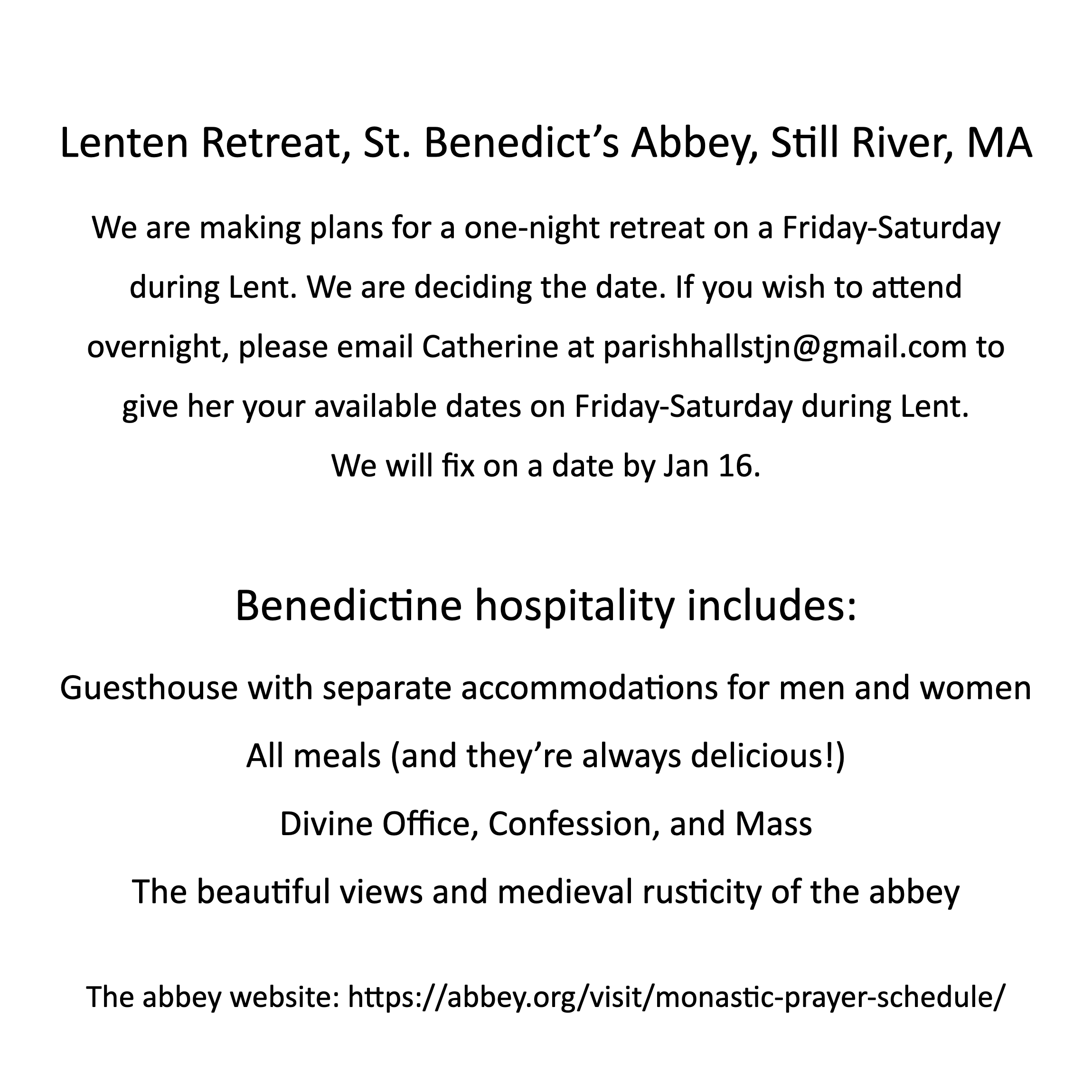 +March 13-15: Lenten retreat at St. Benedict’s Abbey, Still River