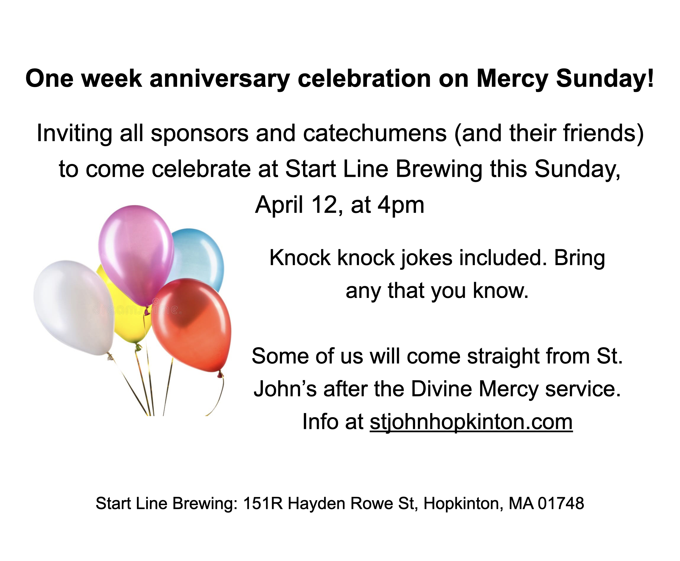 +April 12, Divine Mercy Sunday: St. John’s schedule AND our celebration at Start Line Brewing.